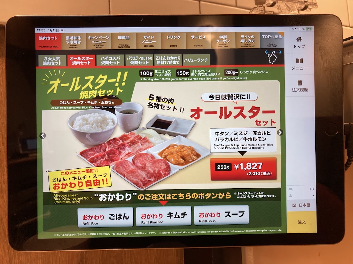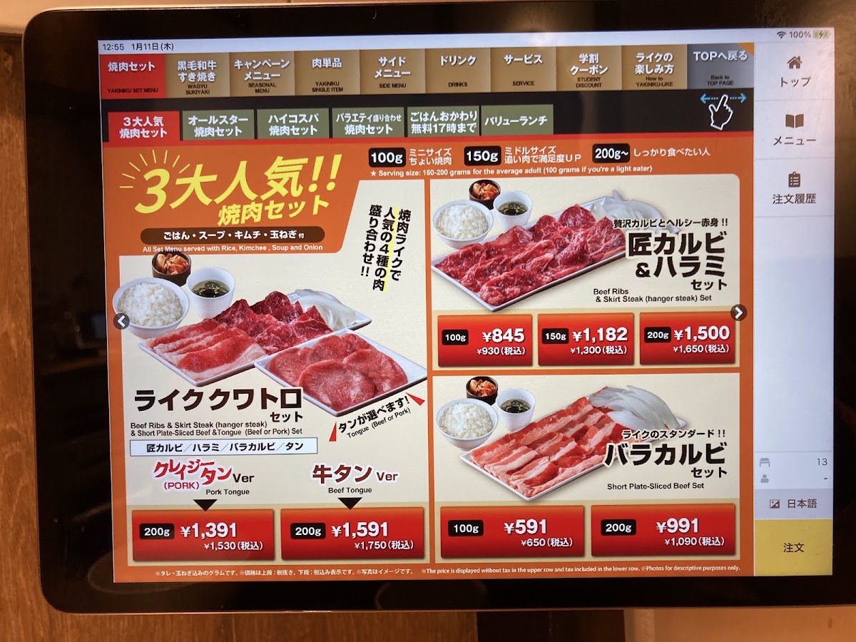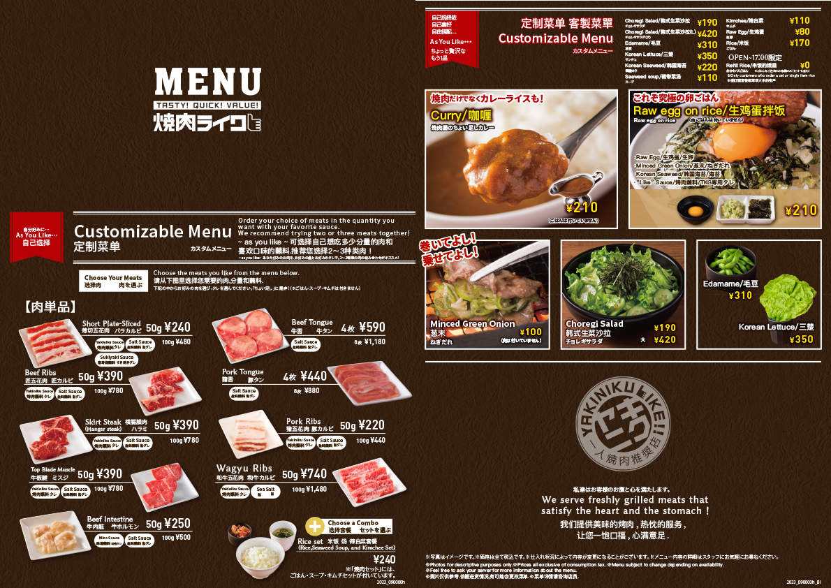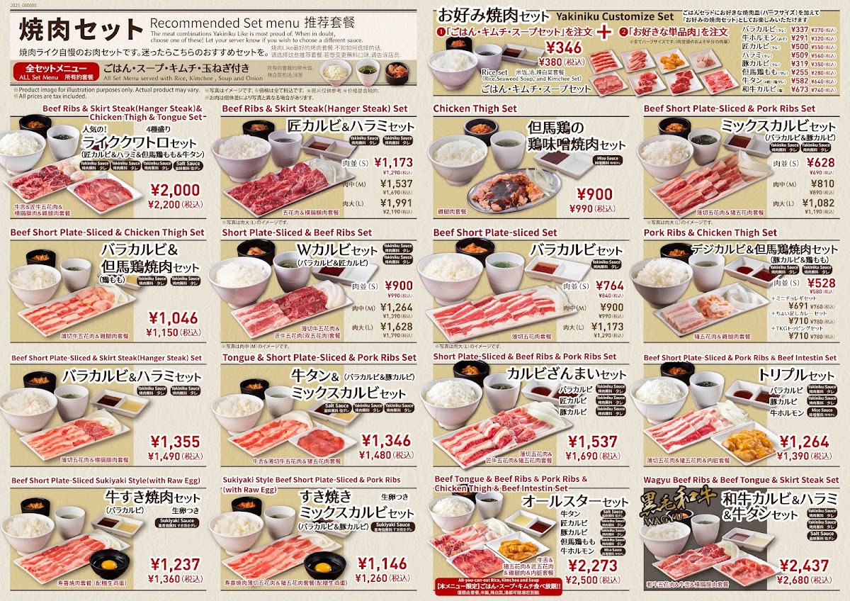 Overall, Yakiniku Like Kawasaki provides a complete yakiniku dining experience with high-quality ingredients and options that satisfy both traditional and adventurous tastes. Whether you're a fan of beef, pork, or chicken, the diverse menu ensures there's a dish that will satisfy any craving, making it a great place to enjoy a delicious meal with friends or family.