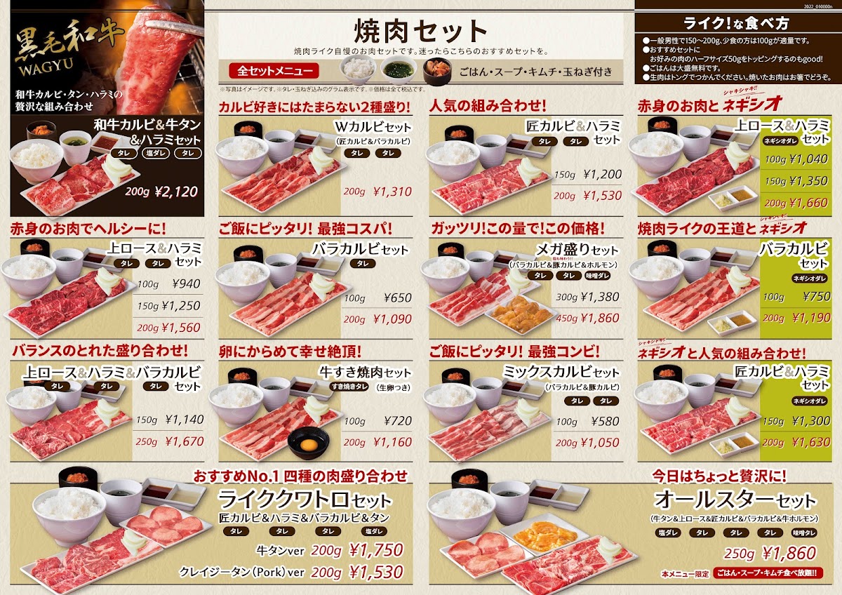 If you're looking for a satisfying yakiniku experience, Yakiniku Like Kawasaki offers a diverse menu that caters to various tastes and preferences. Located at 〒210-0006 Kanagawa, Kawasaki, the restaurant serves a range of meats, side dishes, and specialty items, all designed to deliver a true Japanese BBQ experience.