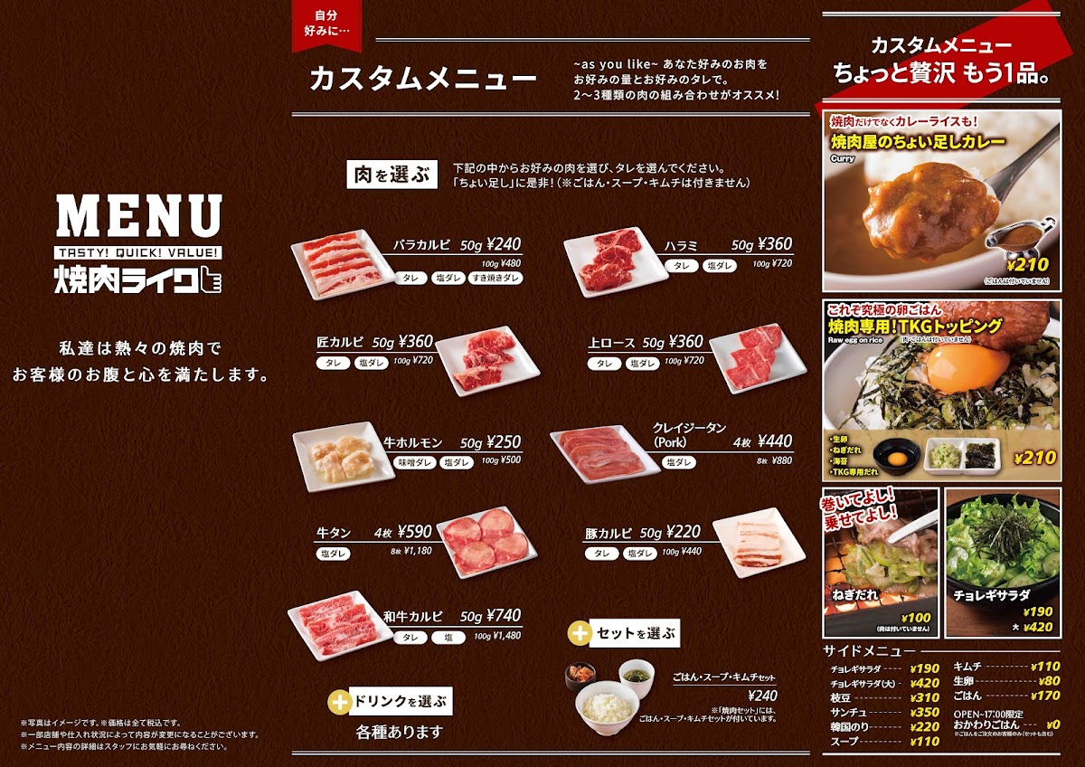 Side dishes are also an essential part of the meal. You can enjoy the Yakiniku Curry, perfect for adding a bit of extra flavor to your meal. For a refreshing complement to the meats, try the Choreggi Salad or the Negi-te Sauce topping, which enhances the savory taste of grilled meats. For a unique twist, the TKG Topping provides a flavorful addition that blends well with the grilled selections.